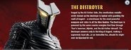 The Destroyer was a magical, consciousless entity built by Odin to defend the Asgardian vaults. It will complete any mission given to it without question, regardless of how long the mission or who gets in its way. Its primary weapon are fiery beams of energy emitted from its face, but it is also superhumanly strong and nearly invulnerable to damage.
