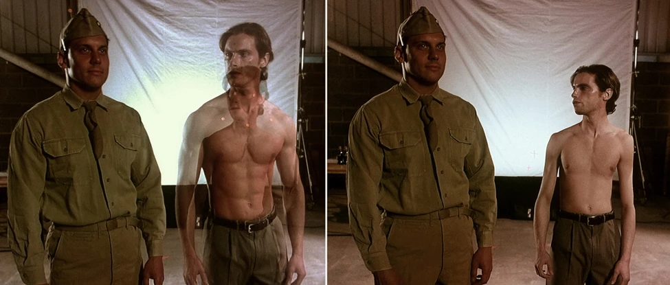 Behind the scenes filming. Skinny Steve Rogers (Paul Warren) visual effects pre-production test